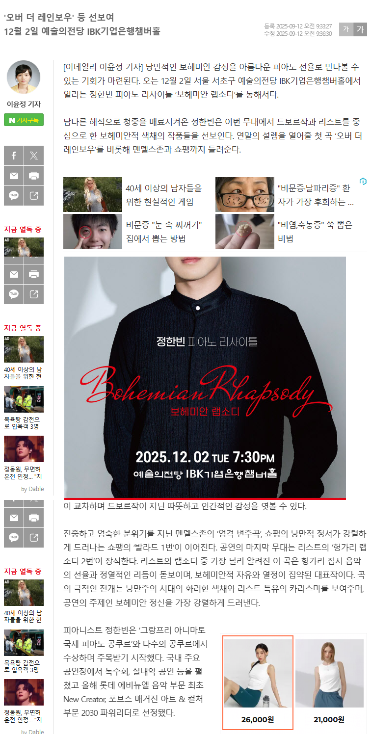 [25.09.12 이데일리] 피아노로 만나는 보헤미안 감성…정한빈 리사이틀