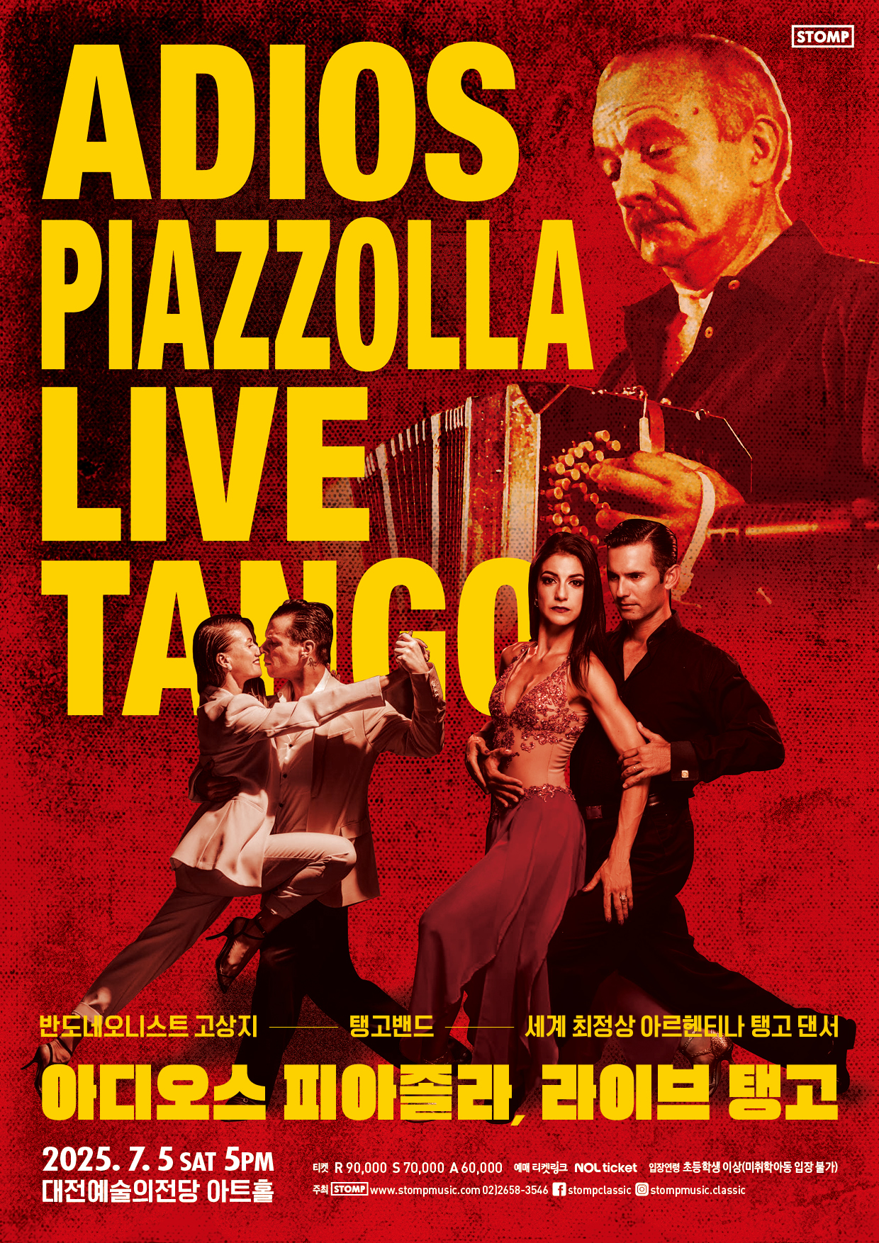 아디오스 피아졸라, 라이브 탱고 - 대전 일시 2025년 7월 5일(토) 오후 5시 장소 대전예술의전당 아트홀 티켓 R석 90,000원 / S석 70,000원 / A석 60,000원 예매처 인터파크 , 티켓링크 주최 / 문의 (주)스톰프뮤직 상세정보