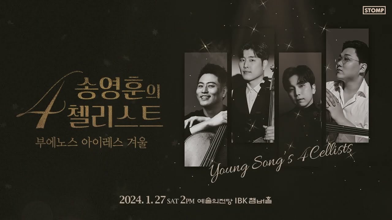 한국을 대표하는 첼리스트 송영훈과 클래식계가 주목하는 첼리스트 조형준, 이경준, 채훈선의 만남! 겨울에 어울리는 클래식, 탱고 그리고 영화음악까지 추운 겨울, 아름답고 매혹적인 4대의 첼로가 선사하는 겨울 서정의 아름다운 선율을 만나보세요 송영훈의 4 첼리스트 - 부에노스 아이레스 겨울 일시장소 : 2024년 1월 27일 (토) 오후 2시 예술의전당 IBK챔버홀 출연진 : 첼리스트 송영훈, 조형준, 이경준, 채훈선 입장연령 : 7세이상 관람가능 예매 : 예술의전당, 인터파크